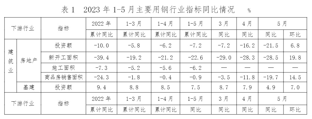 5月,从同比数据来看,房地产主要指标继续下降,基建保持快速增长,增速有所回落; 制造业主要用钢行业中除集装箱外,均有不同程度增长。从环比数据来看,房地产主要指标由降转增,家电行业有所回落,集装箱降幅收窄。