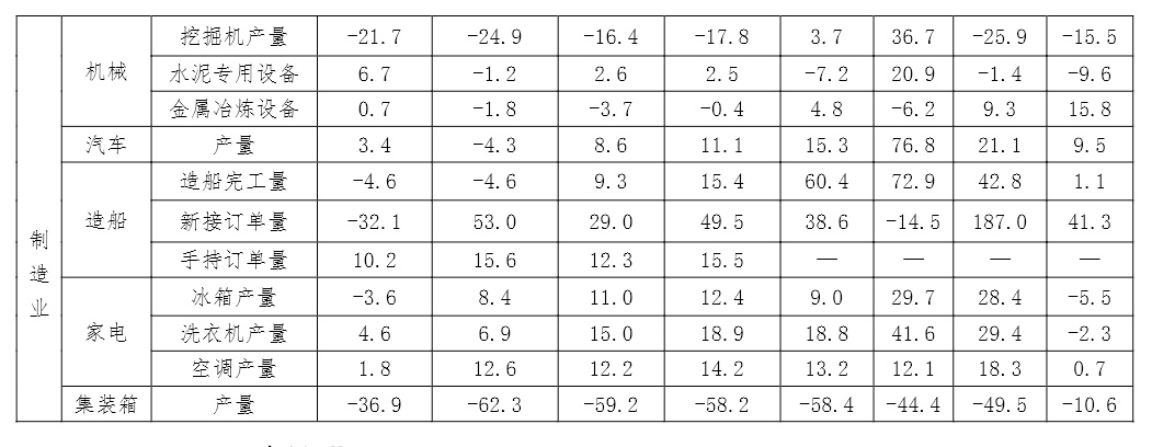 制造业表现呈分化态势。其中,机械行业工业增加值保持正增长,机电产品出口额继续增长,增幅收窄;汽车行业产量保持增长,新能源汽车产量和汽车出口量保持快速增长;船舶行业三大指标持续增长,继续保持较好发展态势;家电行业三大白电产品产量持续上升;集装箱产量降幅持续收窄。