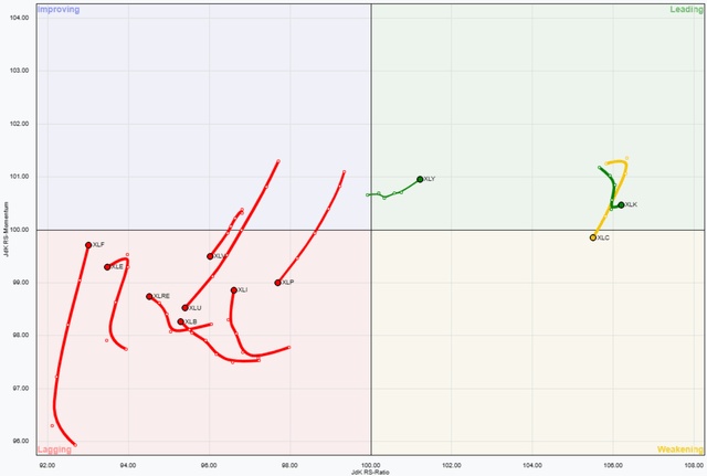 科技股仍然维持其“领先”的低位,但随着所有行业不可避免地以顺时针模式围绕这一图表发展,科技ETF XLK非常接近于成为一个“疲软”的行业,因为由于经济状况不佳,轮动资金将开始离开,并进入更具防御性的行业。
