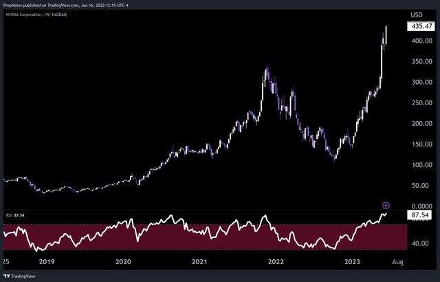 对于像英伟达这样的大公司来说,这种情况并不经常发生。除了特斯拉(特斯拉是目前发生的事情的唯一恰当比较),约87及以上的读数只发生过几次,并且,在这种情况发生后,股价基本上总是通过大幅抛售得到非常密切的纠正。