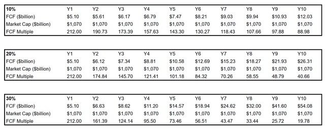 显然,由于英伟达的人工智能基础设施/芯片业务,市场预计该公司的财务业绩将大幅增长。然而,在以自由现金流衡量的211倍估值下,即使未来10年每年增长20%,也会使该股在2033年变得昂贵: