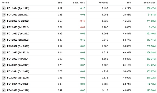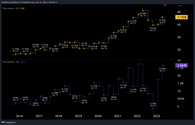 上一季度,该公司的销售额为71.9亿美元,自由现金流为26亿美元。这些数字表明,该公司的自由现金流同比增长接近100%,利润率达到了令人难以置信的36%。这一业绩建立在长期稳定的营收和每股收益的基础上: