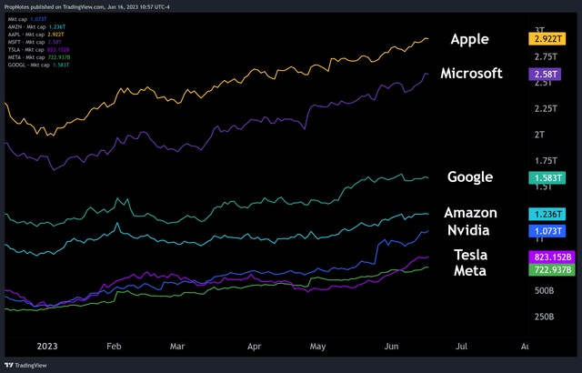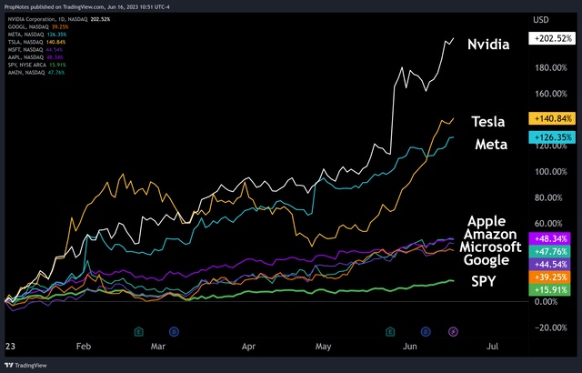 自今年年初以来,英伟达股价涨幅接近200%,这场人工智能热潮令该股的股价表现碾压了所有其他主要上市公司,并在2023年迄今为止标普500指数的涨幅中占了相当大的比例: