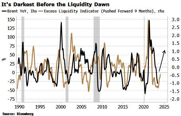 对于原油而言,流动性状况的改善通常是游戏规则的改变者。原油是一种风险资产。虽然它最终必须遵守供求规律,但在中期(3-6个月),它通常更多地受到流动性的影响,特别是流动性过剩(定义为货币增长与经济增长之间的差异)。