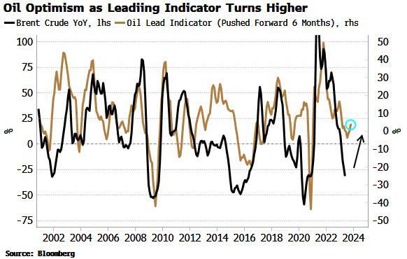 怀特表示,从流动性的角度来看,乐观的油价前景得到了“主要原油指标”(Oil leading indicator )回升的支撑;怀特表示,该指标并非基于流动性,而是由原油曲线、经济增长数据和原油供应所驱动。如下图所示,该指标预计油价将很快开始走高。