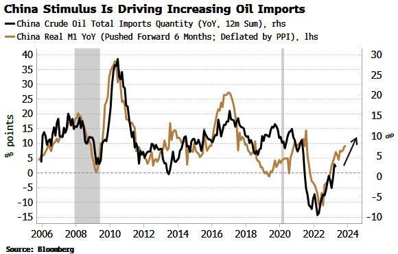 油价未能反弹的一个关键原因是中国的原油需求。怀特表示,中国已经开始增加原油进口(有消息称一家大型炼油商购买大量原油),或许是在利用油价低迷的机会增加其原油储备量。不管具体原因是什么,这一趋势可能会持续下去。怀特表示,中国逐步宽松的政策,以及持续宽松的预期,使得流动性更为宽松,具体表现为实际M1数据增长。如下图所示,怀特预计中国原油进口量将继续上升。