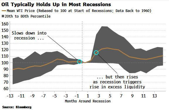 美国经济衰退预期也是阻碍油价复苏的重要因素。如果美国经济真的陷入衰退会发生什么?通常的假设是,经济衰退对油价极为不利。但怀特指出,真实的情况可能并非如此,平均而言,油价在衰退前往往会被大举抛售,但在接下来的六个月里会有所反弹。