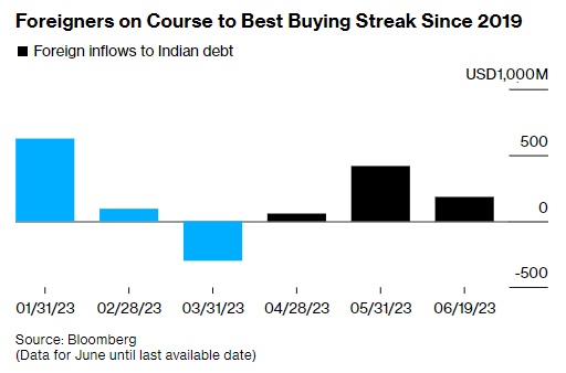 智通财经APP获悉,随着印度增长前景向好和经济趋于稳定,外国投资者正在抢购这个南亚国家的债券。汇编数据显示,到目前为止,外资在6月份购买了价值1.845亿美元的印度债券,这是外资连续第三个月购买该国债券,也是自2019年8月以来持续时间最长的一次。