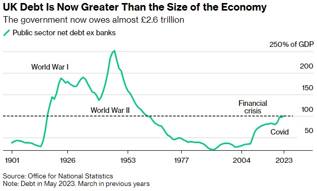 智通财经APP注意到,自1961年以来,不断飙升的利率和通货膨胀使英国政府债务首次超过GDP的100%,打击了英国首相苏纳克降低债务的承诺,并削弱了在明年大选前减税的希望。