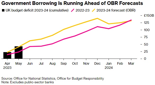 今年5月,英国政府支出比收入多出200亿英镑(255亿美元),超过了私营部门经济学家和独立预算责任办公室(OBR)的预测。