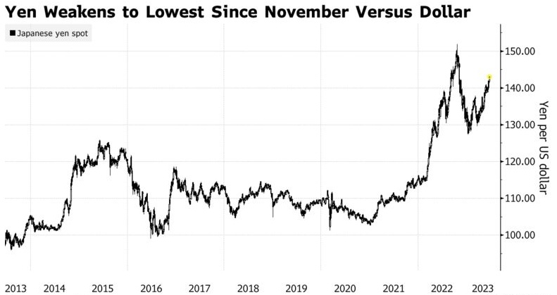 智通财经APP获悉,随着日元跌向去年日本政府出手干预支撑日元的水平,外汇交易员正在紧盯日本政府是否会再次出手。周五,美元兑日元汇率超过143,前一交易日下跌近1%,连续四日刷新上周五所创的去年11月以来高位,向去年10月涨破150后所创的1990年来高位靠近。与此同时,日元兑瑞士法郎汇率跌至创纪录水平,兑欧元汇率跌至2008年以来的水平。