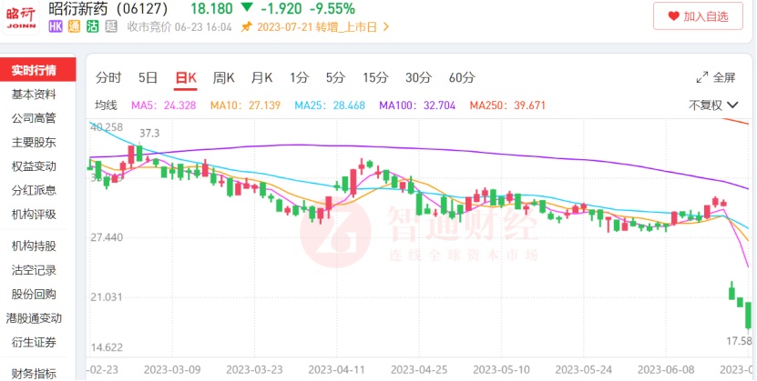 从二级市场表现来看,自今年1月下旬以来,昭衍新药的港股股价就处在波动下跌状态。6月23日,昭衍新药股价低开低走,盘中一度跌至最低17.58港元,刷新年初至今的最低价,较1月16日阶段性高点35.07港元累计下跌49.87%,股价半年内“腰斩”。