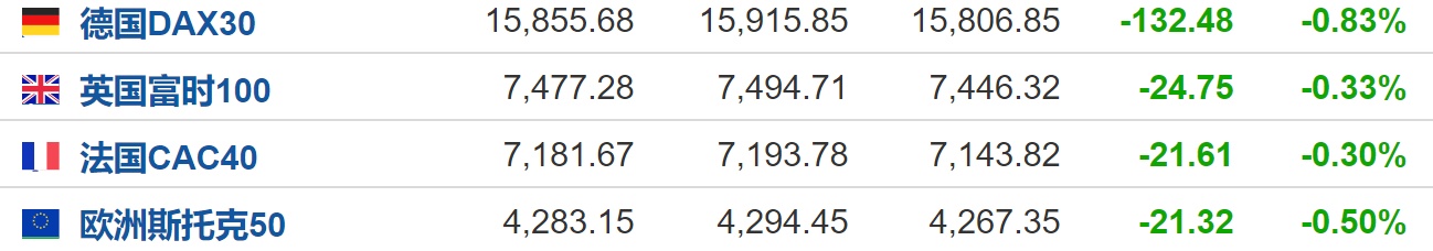 2.截至发稿,德国DAX指数跌0.83%,英国富时100指数跌0.33%,法国CAC40指数跌0.30%,欧洲斯托克50指数跌0.50%。