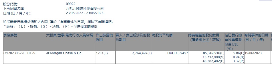 智通财经APP获悉,香港联交所最新资料显示,6月19日,小摩减持九毛九(09922)276.4497万股,每股作价13.9457港元,总金额约为3855.28万港元。减持后最新持股数目约为8534.99万股,最新持股比例为5.86%。