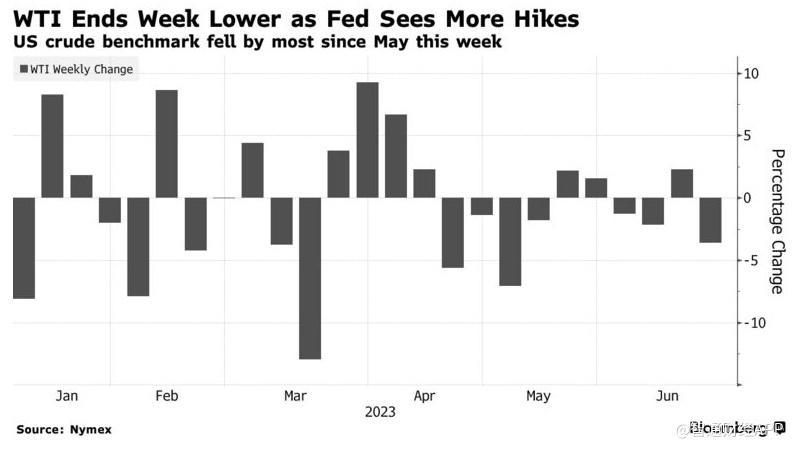 智通财经APP获悉,本周,美油价格录得自5月初以来的最大周跌幅,主要是因为美联储暗示未来可能会加息,同时欧洲的数据显示经济可能会放缓。