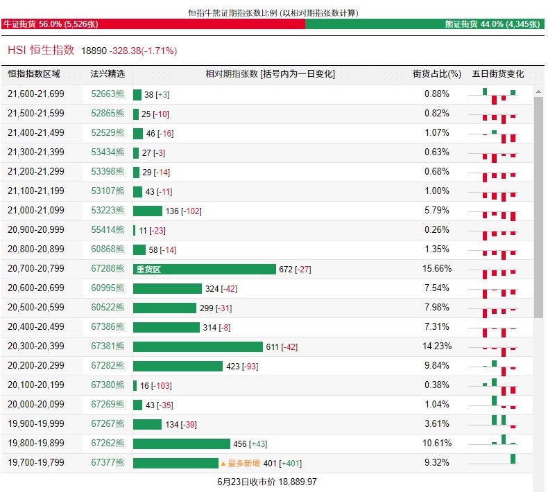 法兴恒指牛熊证街货分布图中的数据显示,熊证街货重货区在20700-20799区间,该区间最新熊证数量为672张,较上一交易日减少27张;最多新增在19700-19799区间,该区间最新熊证数量为401张,较上一交易日增加401张。