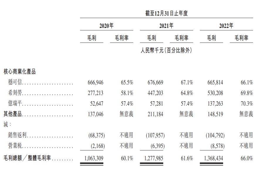 如今,亿腾医药已将抗感染、CVD及呼吸系统的治疗领域确定为公司目前的战略重点,在该等治疗领域中,亿腾医药专注于识别具有强大管线内协同潜力的创新而风险较低的疗法。自2020年至2022年期间,稳可信、希刻劳及亿瑞平的终端市场销量分别增长了34.9%、83.7%及182.1%。相关产品毛收入及毛利率情况如下: