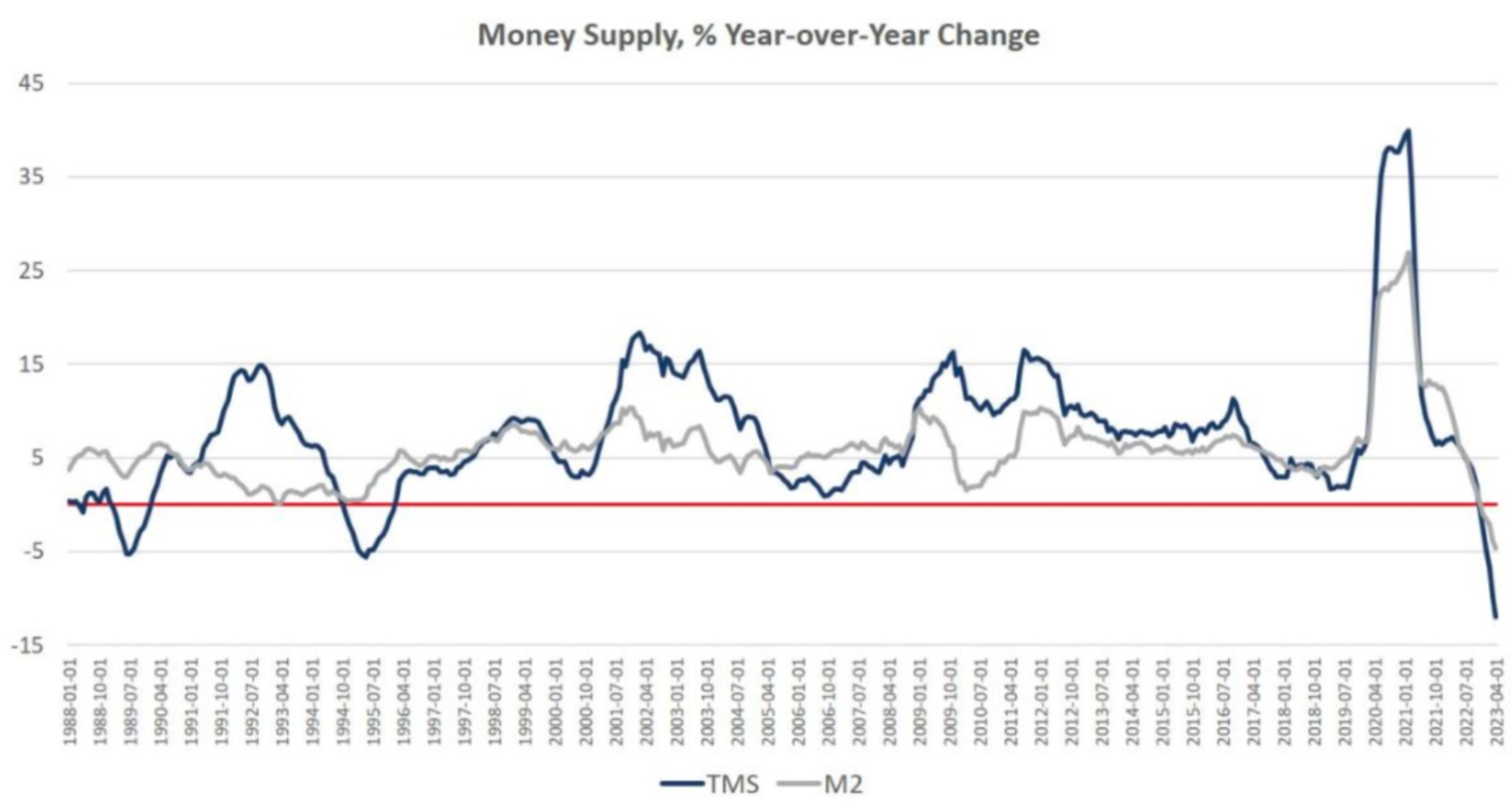 经济衰退之前往往只是货币供应增长放缓,货币供应量并不一定要实际收缩才能引发萧条。但近几个月我们看到的跌入负值的情况确实有助于说明货币供应增长下降的程度和速度。这通常是经济增长和就业的危险信号。