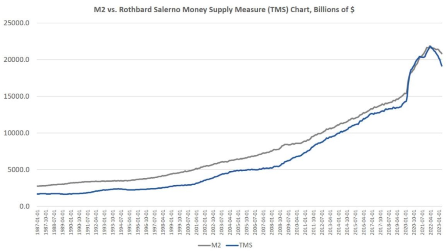 上图所使用的货币供给度量TMS是由穆雷·罗斯巴德和约瑟夫·萨勒诺开发的度量,这一货币供应指标与M2的不同之处在于,它包括美联储的国债存款(不包括短期存款和零售货币基金)。Mises Institute定期跟踪这一指标,认为其能提供比M2更好的货币供给波动度量。