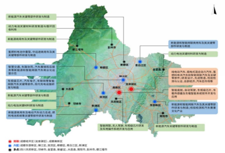 “多点”即四川天府新区、新津区、邛崃市、金堂县、新都区、大邑县、简阳市、彭州市、都江堰市,打造配套体系关联发展地。四川天府新区重点发展智能座舱、自动驾驶、车规级芯片研发及车用操作系统开发与应用。邛崃市、金堂县重点发展动力电池关键材料研发与制造。新都区、大邑县、简阳市重点发展新能源汽车关键零部件研发与制造。彭州市重点发展动力电池关键材料研发制造与循环回收利用。都江堰市重点发展涵盖客车、公交、物流等车型的新能源商用车及关键零部件研发与制造。