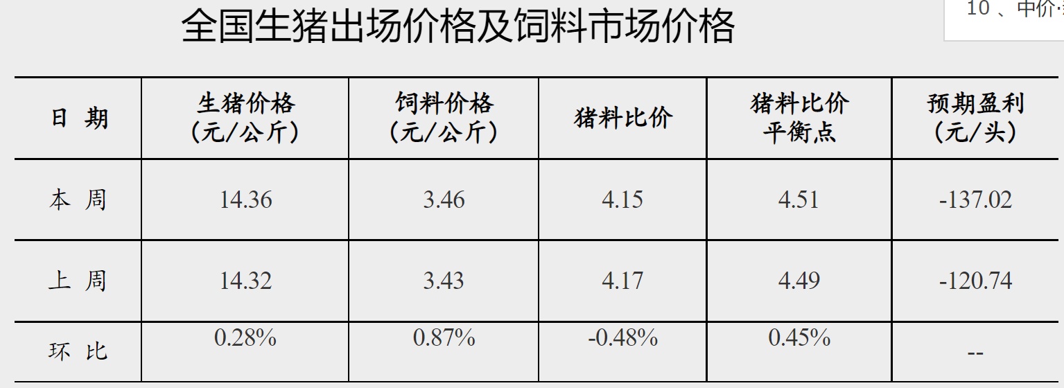 智通财经APP获悉,据国家发改委6月26日消息显示,6月21日当周全国猪料比价为4.15,环比下降0.48%。按目前价格及成本推算,未来生猪养殖头均亏损为137.02元。猪价以降为主,但周均价环比微涨。由于对端午节后生猪市场行情看空,养殖端出栏积极性提升,市场供应量短时增多,加之屠宰企业节前备货基本完成,生猪消化速度放缓,猪价偏弱运行。本周临近月末,局部地区生猪出栏量或有所减少,对行情有一定支撑作用,但终端需求依旧较差,预计短期生猪价格或持续低位运行。