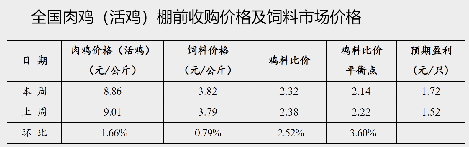 6月21日当周全国鸡料比价为2.32,环比下降2.52%。按目前价格及成本推算,未来肉鸡养殖预期盈利为1.72元/只。本周鸡产品走货速度不快,屠宰企业盈利情况欠佳,高价收购毛鸡意向不足,同时受高温天气影响,毛鸡出栏量略有集中,供求双面利空市场,鸡价继续下滑。下周毛鸡出栏量或较为稳定,而需求延续弱势,预计鸡价或低位盘整,涨跌空间较为有限。