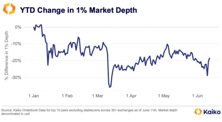 智通财经APP了解到,,加密货币“市场深度”(Crypto market depth)今年一直处于非常低的水平。市场深度通常指的是市场吸收规模相对较大的买卖指令的能力。当市场深度较低,大玩家下订单购买或出售加密货币资产时,价格可能会大幅上涨或下跌,即使订单不是那么大。