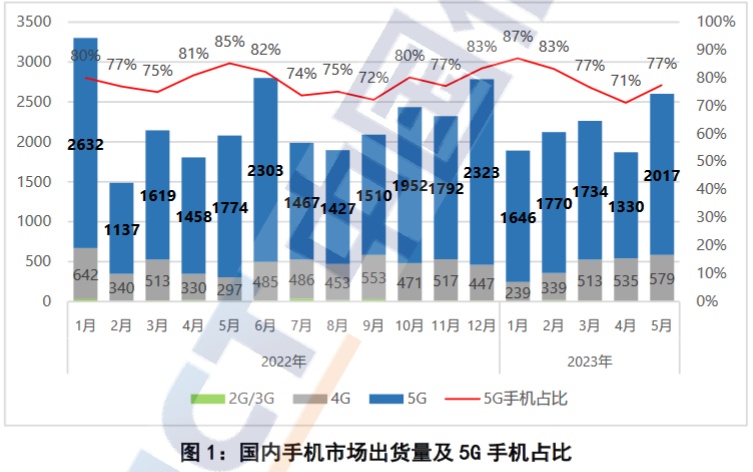 智通财经APP获悉,6月26日,中国信通院发布发布2023年5月国内手机市场运行分析报告。2023年5月,国内市场手机出货量2603.7万部,同比增长25.2%,其中,5G手机2016.9万部,同比增长13.7%,占同期手机出货量的77.5%。2023年1-5月,国内市场手机总体出货量累计1.08亿部,同比下降0.7%,其中,5G手机出货量8496.7万部,同比下降1.4%,占同期手机出货量的79.0%。