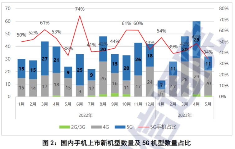 2023年5月,国内手机上市新机型32款,同比增长33.3%,其中5G手机11款,同比增长22.2%,占同期手机上市新机型数量的34.4%。2023年1-5月,上市新机型累计181款,同比增长8.4%,其中5G手机78款,同比下降10.3%,占同期手机上市新机型数量的43.1%。