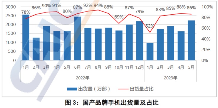 2023年5月,国产品牌手机出货量2243.4万部,同比增长35.1%,占同期手机出货量的86.2%;上市新机型31款,同比增长34.8%,占同期手机上市新机型数量的96.9%。