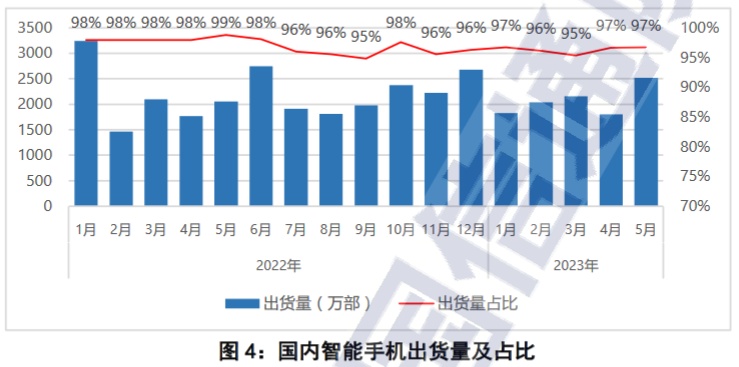 2023年5月,智能手机出货量2519.6万部,同比增长22.6%,占同期手机出货量的96.8%。2023年1-5月,智能手机出货量1.04亿部,同比下降2.6%,占同期手机出货量的96.3%。