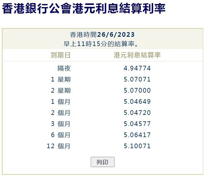 智通财经APP获悉,6月26日,港元需求减退,拆息连续两日全线下跌,其中,隔夜息连跌四天,终于跌穿5%,低见4.94774%,创近一周新低,而与楼按相关的一个月拆息亦三连跌,进一步降至5.04649%,与同期美元LIBOR息差略为扩阔至10基点。