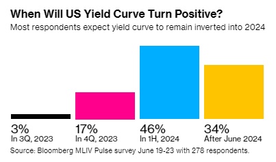 这表明,过去15个月债券市场的异常波动或将持续下去。80%受访者预测,美国收益率曲线将一直倒挂至2024年。
