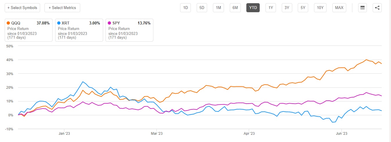 相比于涵盖苹果(AAPL.US)、微软(MSFT.US)和英伟达(NVDA.US)等众多明显科技股的纳斯达克100指数ETF(QQQ.US),涵盖沃尔玛(WMT.US)等消费股的标普零售指数ETF(XRT.US)今年表现非常平淡,该ETF今年以来仅仅上涨约3%。而在围绕AI的投资狂潮刺激下,纳指100ETF年内涨幅高达37%。