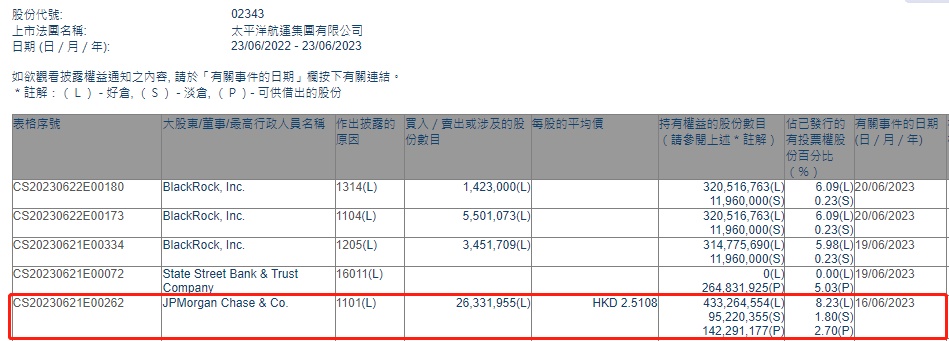 智通财经APP获悉,香港联交所最新资料显示,6月16日,小摩增持太平洋航运(02343)2633.1955万股,每股作价2.5108港元,总金额约为6611.43万港元。增持后最新持股数目约为4.33亿股,最新持股比例为8.23%。