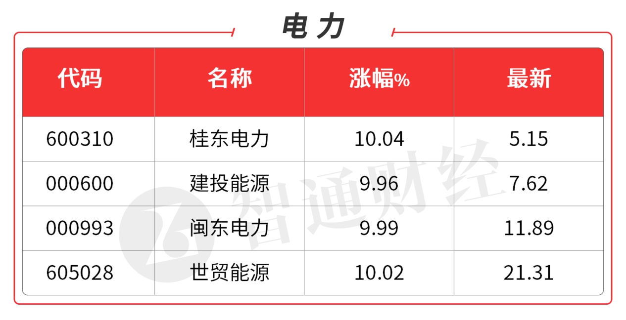 北京观象台观测史上首次出现连续三日超40℃,电力板块逆势走强,龙头杭州热电(605011.SH)涨停,深南电A(000037.SZ)、新中港(605162.SH)2连板,桂东电力(600310.SH)、建投能源(000600.SZ)、闽东电力(000993.SZ)等超10只个股涨停。