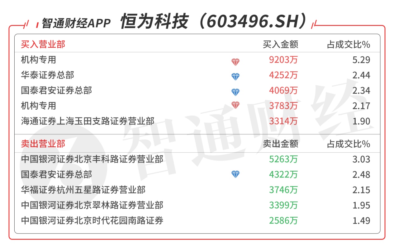 恒为科技(603496.SH):受到众多机构青睐,今日共2个机构席位出现在龙虎榜单上,合计净买入1.3亿元,买二是量化基金的席位买入4252万元,当日净买入5306万元,该股今日强势反包,强势特征明显。