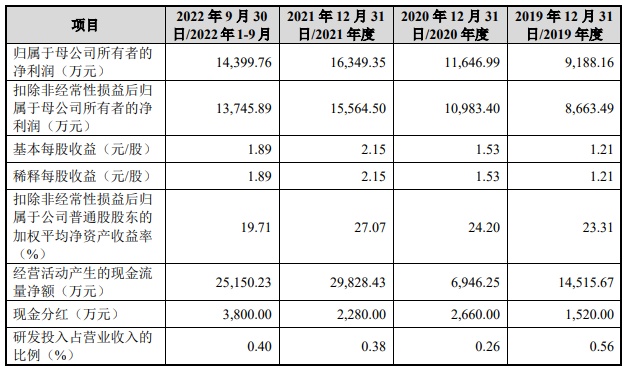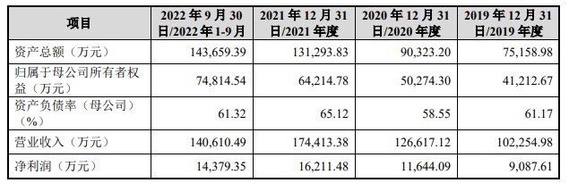 财务方面,于2019年、2020年、2021年及2022年1-9月,公司实现营业收入分别约为10.23亿元、12.66亿元、17.44亿元及14.06亿元人民币;同期,净利润分别约为9087.61万元、1.16亿元、1.62亿元、及1.44亿元人民币。