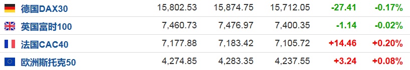 2.截至发稿,德国DAX指数跌0.17%,英国富时100指数跌0.02%,法国CAC40指数涨0.20%,欧洲斯托克50指数涨0.08%。