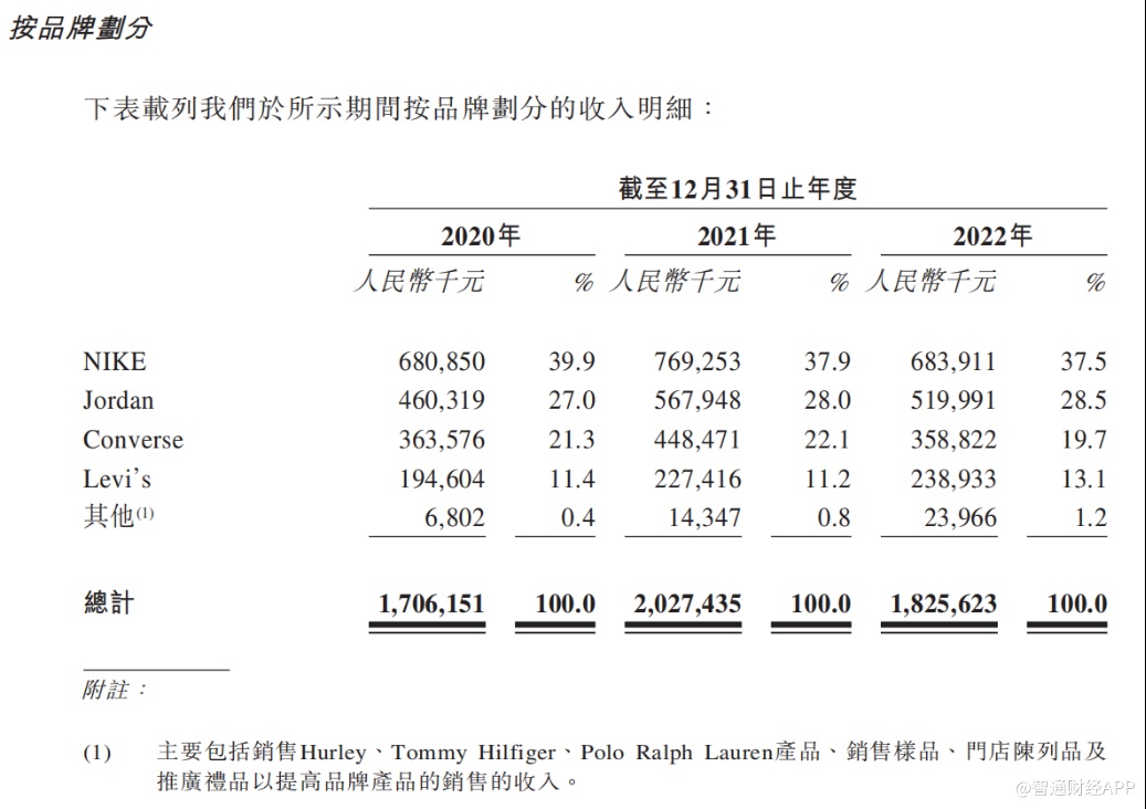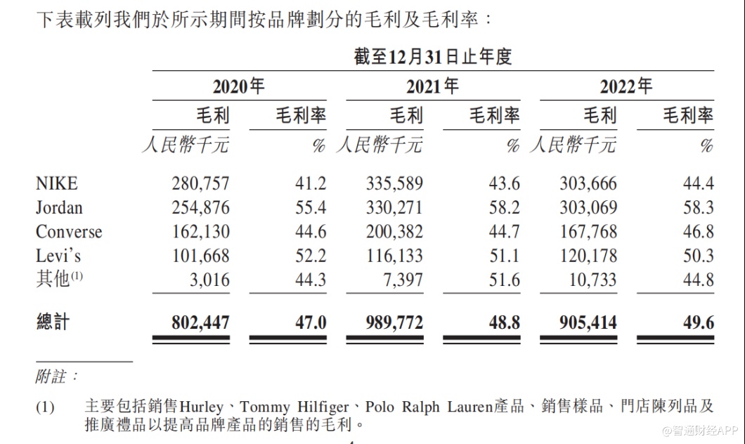 公司称,毛利率提升,得益于NIKE、Jordan及Converse的产品毛利率于2020年至2022年有所改善。主要是由于更优的产品组合,其中服装产品销售在期内上述品牌产品所得收入中占比较高。