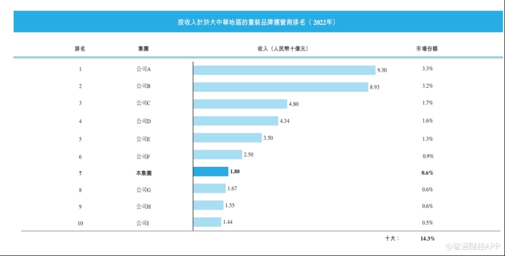 凭借NIKE等服装品牌的知名度以及广泛的渠道覆盖,永兴东润走在了大中华童装品牌运营商前列。根据弗若斯特沙利文报告,按收入计,永兴东润于2022年在大中华地区童装品牌运营商中排名第七,市场份额为0.6%。按收入计,永兴东润亦是2022年大中华地区排名第一的专营童装品牌运营商。
