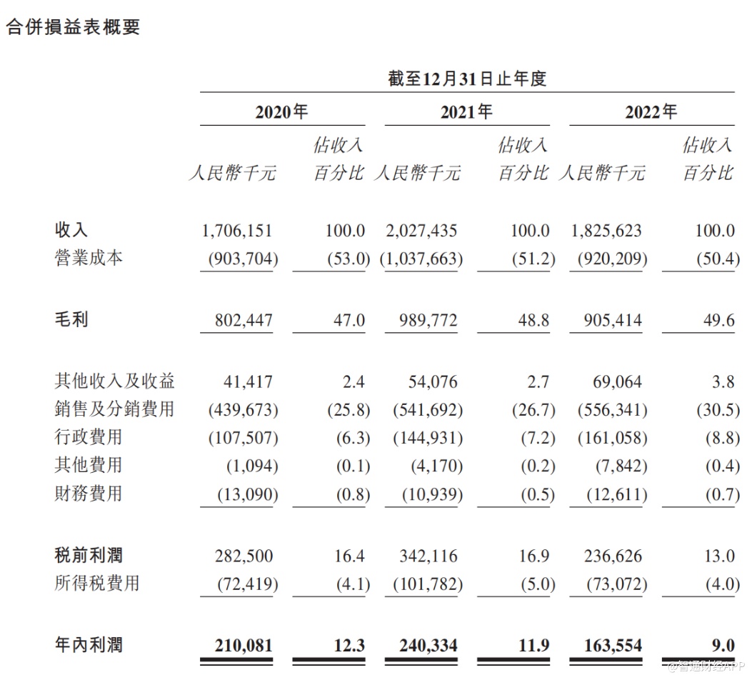 业绩方面,于2020年、2021年及2022年,永兴东润的收入分别为17.06亿元(人民币,下同)、20.27亿元及18.26亿元。同期利润分别为2.10亿元、2.40亿元及1.64亿元。上述期间,公司的销售毛利率从47%逐年递增至49.6%,但同期净利润率却从12.3%逐年下滑至9%。