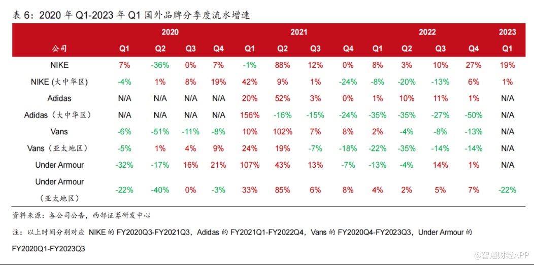 西部证券研报显示,耐克在大中华区的流水,从2021年第四季度开始出现连续4个季度下滑,尽管从2022第四季度和2023第一季度增速回正,但分别仅有6%和1%的增长。