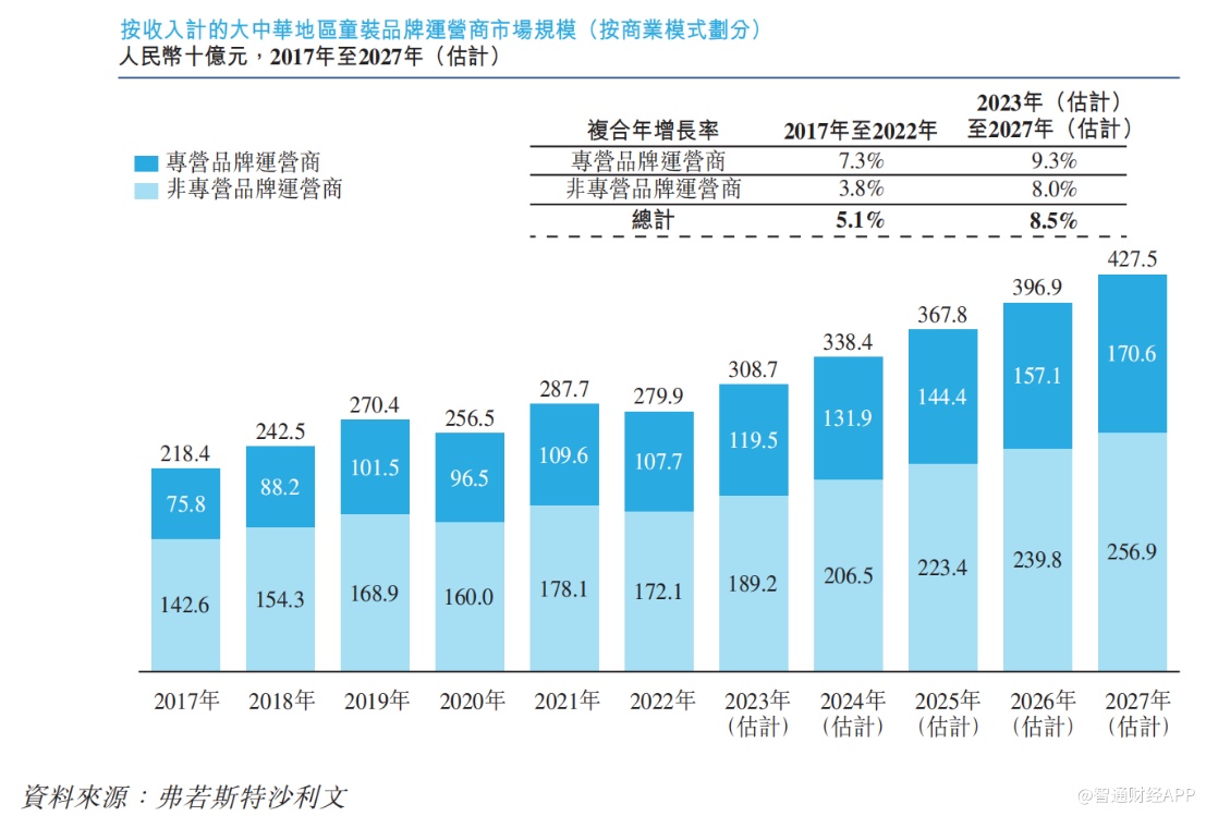 根据弗若斯特沙利文报告,于2022年,大中华地区童装品牌运营商的市场规模达2,799亿元。2022年,专营品牌运营商的销售收入为1,077亿元,市场份额为38.5%。预计大中华地区童装品牌运营商的市场规模将持续增长,由2023年的3,087亿元按8.5%的复合年增长率增至2027年的4,275亿元。于2023年至2027年,预期专营品牌运营商的销售收入增长速度将快于非专营品牌运营商。
