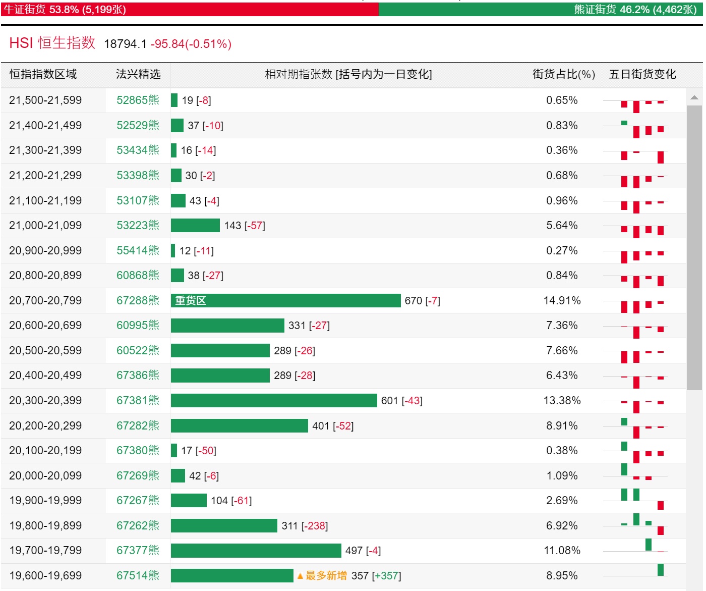法兴恒指牛熊证街货分布图中的数据显示,熊证街货重货区在20700-20799区间,该区间最新熊证数量为670张,较上一交易日减少7张;最多新增在19600-19699区间,该区间最新熊证数量为357张,较上一交易日增加357张。