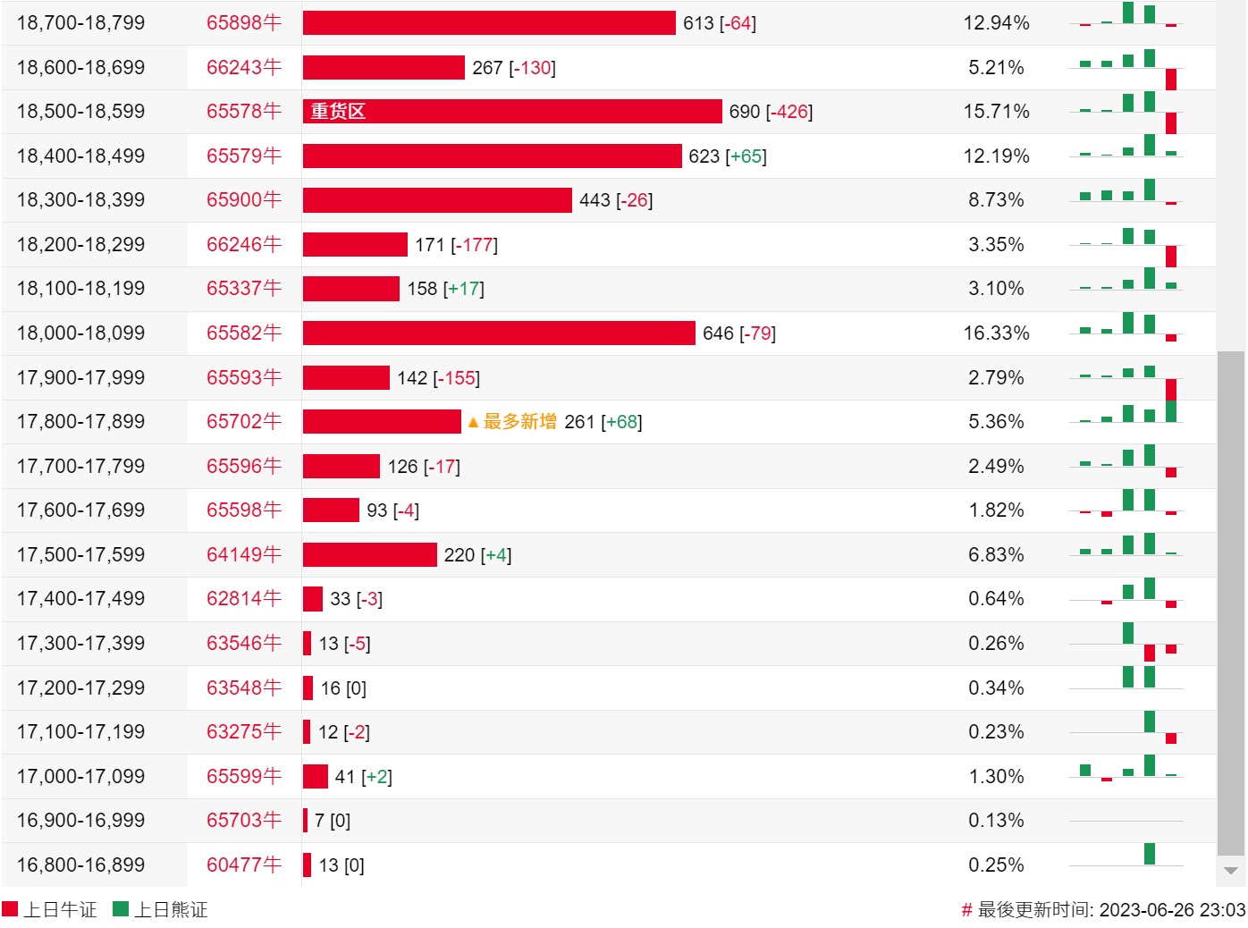 牛证街货重货区在18500-18599区间,该区间最新牛证数量为690张,较上一交易日减少426张;最多新增在17800-17899区间,该区间最新牛证数量为261张,较上一交易日增加68张。
