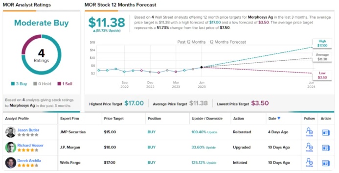 Archila给予MorphoSys“增持”评级,目标价为17美元,预计一年内的上涨潜力为125%。总体而言,根据4位分析师的评级,包括3个“买入”和1个“卖出”,华尔街对该股的一致评级为“中等买入”,该股目前的定价为7.50美元,平均目标价为11.38美元,这意味着该股未来12个月有可能将较当前水平上涨约52%。