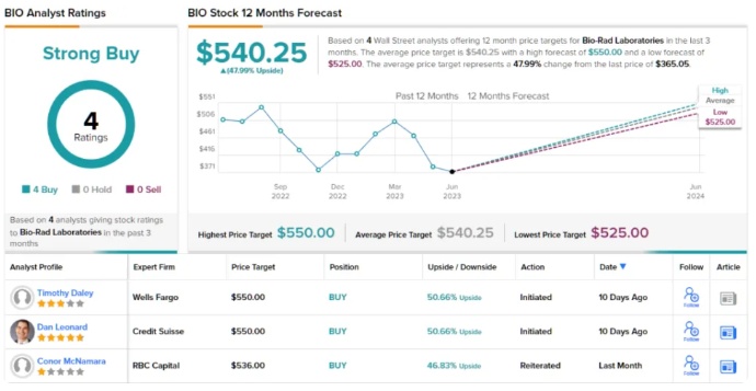 Daley给予Bio-Rad“增持”评级,并将目标价定位550美元。Daley并不是唯一一个长期看好Bio-Rad的分析师。该公司的股票最近获得的分析师评论都是积极的,分析师一致认为该公司的股票评级为“强力买入”。该股目前的交易价为365.80美元,平均目标价为540.25美元,这意味着一年内可能上升约48%。