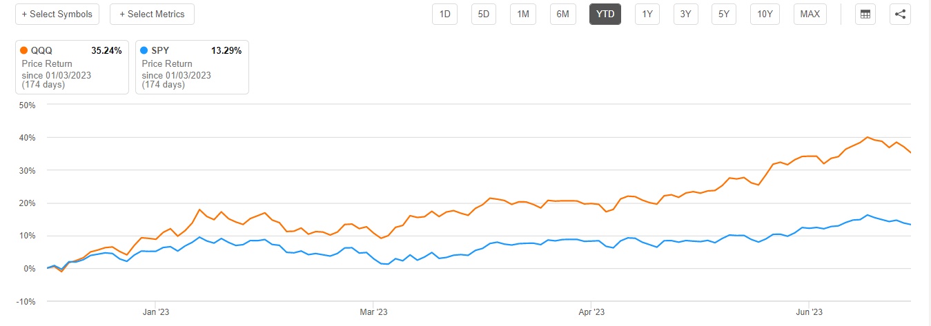 今年以来,美股市场围绕AI的投资狂潮推动大型科技公司,以及更广泛科技公司的股价屡创新高,科技股风向标——纳斯达克100指数已经上涨超35%,早已步入技术性牛市。然而在上周,美联储主席鲍威尔在国会强调美联储年内还将加息两次的鹰派发言后,市场对于美联储年内降息的押注开始退场,衰退预期升温,尤其是制造业PMI等经济指标都发出衰退预警;因此,标普500指数以及纳斯达克100指数在上周收跌,标普500指数未能实现连续6周收涨。