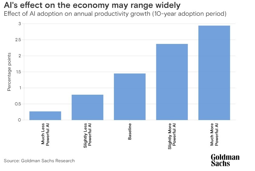 高盛的经济学家团队预计,人工智能的采纳和普及可能在10年内每年将生产率提高大约1.5个百分点,因此,高盛研究团队预计,未来20年标普500指数每股收益的复合年增长率将为5.4%,而目前他们的股息贴现模型假设的每股收益复合年增长率为4.9%,这意味着标普500指数的公允价值将比现在高出大约9%。
